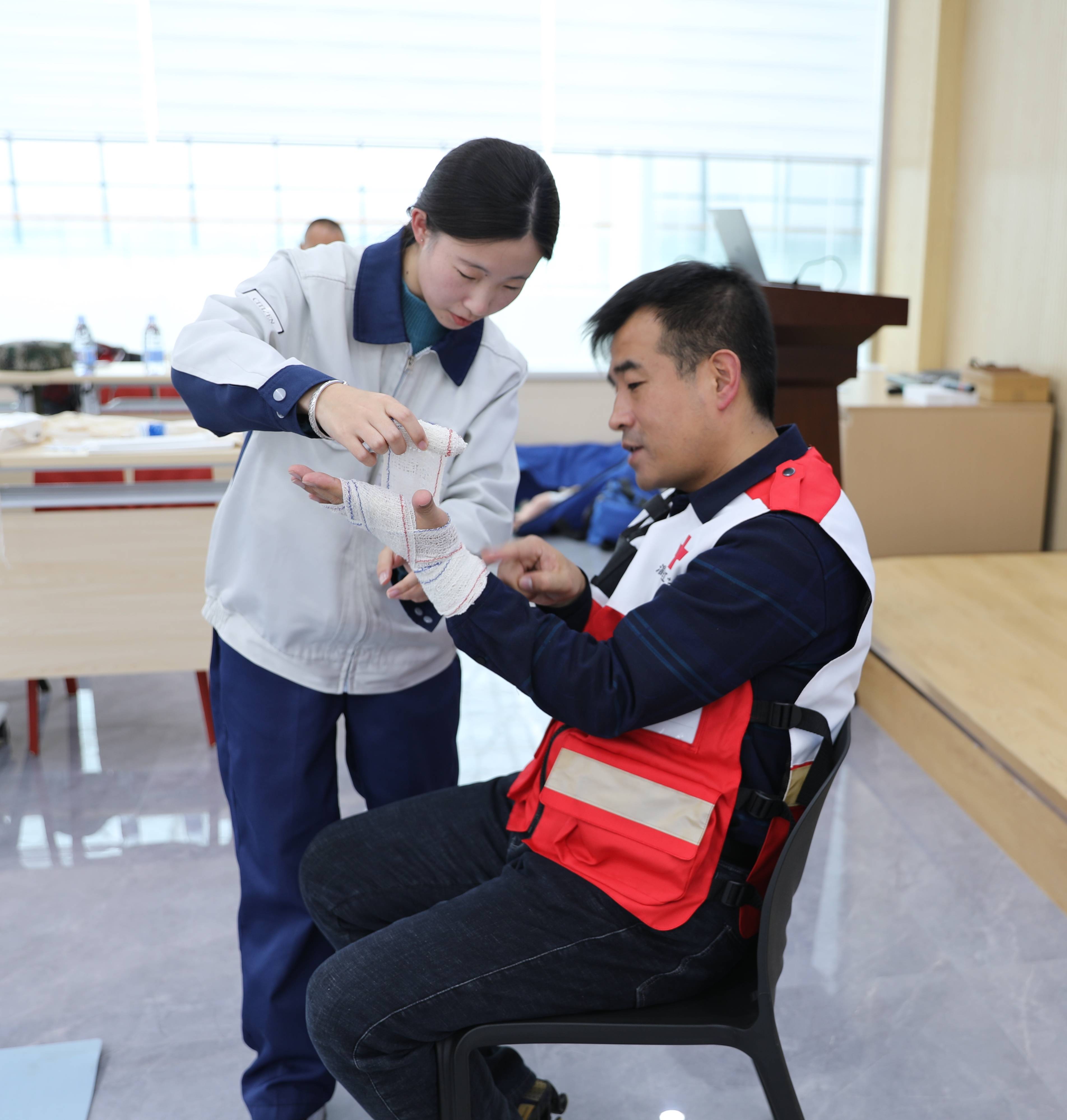 圖為培訓老師指導學員進行創傷救護包扎