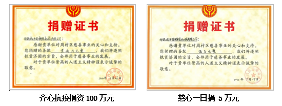 2022年3月,周村疫情嚴(yán)峻,企業(yè)快速作出反應(yīng),齊心抗疫,第一時(shí)間向周村慈善總會(huì)捐款 100 萬(wàn)元,體現(xiàn)企業(yè)的責(zé)任和擔(dān)當(dāng)。疫情期間,公司各級(jí)領(lǐng)導(dǎo)員工同吃同住在公司,保證大家的生活和公司運(yùn)營(yíng),為奪取疫情防控和實(shí)現(xiàn)社會(huì)責(zé)任發(fā)展雙勝利做出了不可磨滅的貢獻(xiàn)。